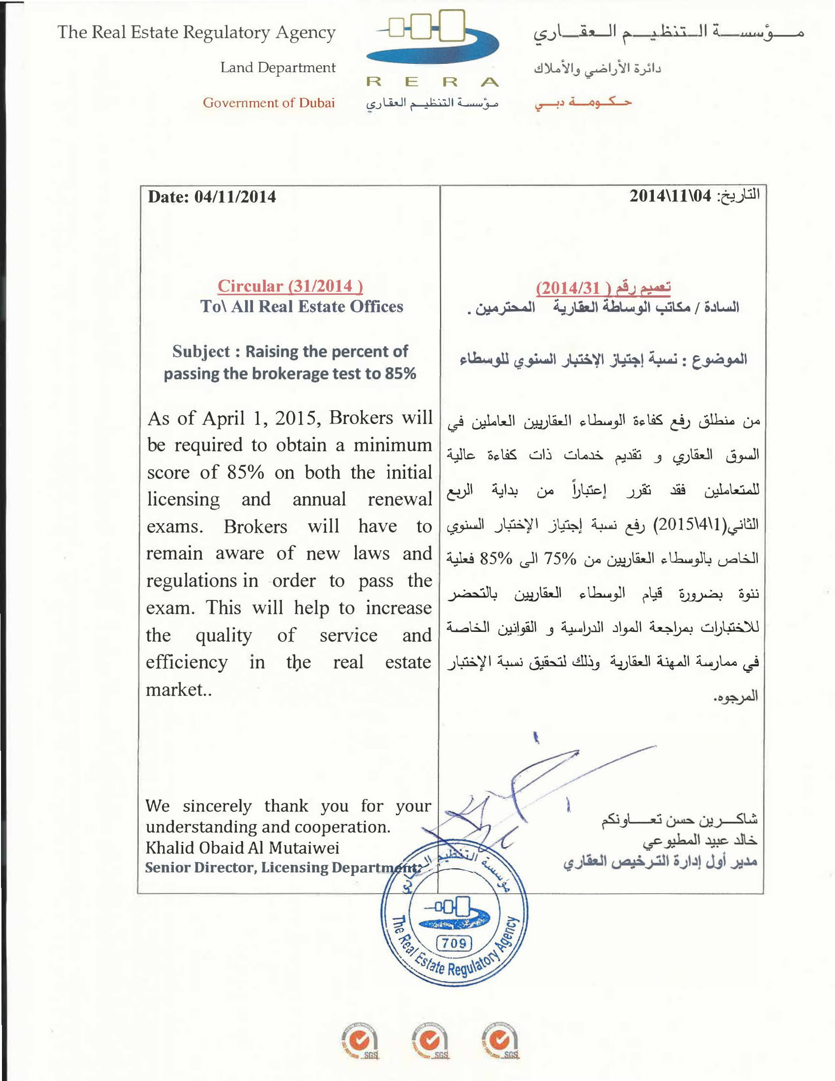 Несмотря на то, что законодательством Дубая не предусмотрено дополнительных требований к образованию или опыту работы менеджеров или участников компании, оказывающей брокерские услуги в сфере недвижимости, любое лицо в компании (в том числе инвестор, который не будет работать с клиентами) обязано сдавать экзамены от RERA.